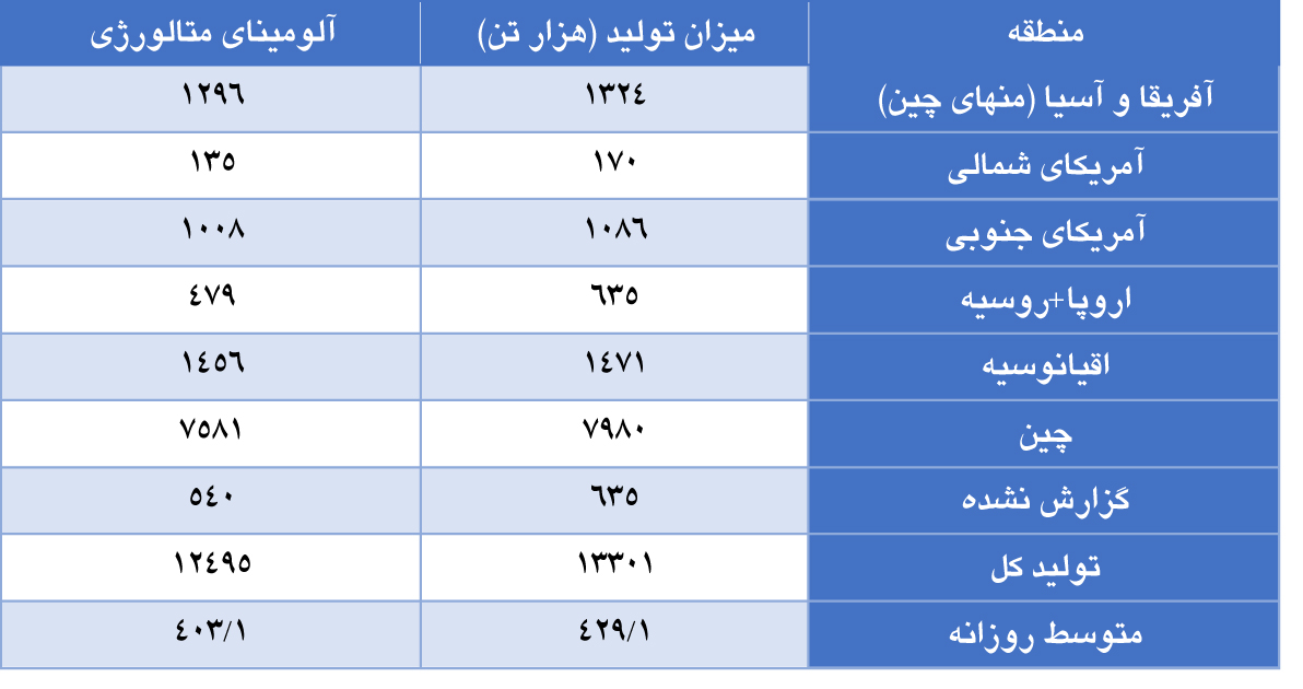 در ادامه، میزان تولید جهانی آلومینا و آلومینای متالورژی در سطح جهان طی ماه آگوست سال جاری آمده است: