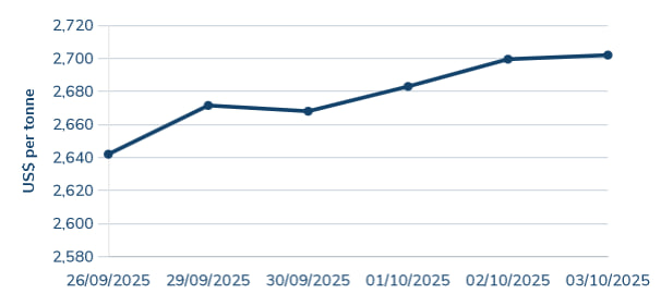 به‌گزارش باشگاه آلومینیوم، همچنین در روز جمعه 11 مهر ماه (30 اکتبر)، بورس فلزات درحالی به‌کار خود پایان داد که قیمت فروش نقدی آلومینیوم در بورس 2702 دلار (تن) اعلام گردید.
