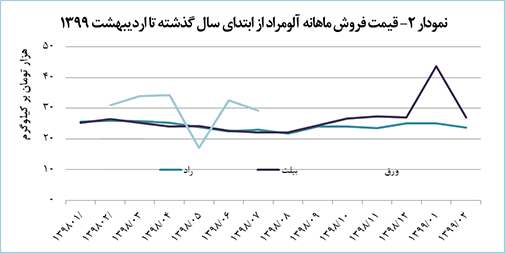 شرکت آلومراد در اردیبهشت ماه سال 1399 توانست در کل 154 تن بیلت بفروشد و این میزان نسبت به فروردین ماه سال 1399 که 23 تن فروش داشته، 569 درصد رشد و نسبت به مدت زمان مشابه در سال 1398 که میزان فروش 41 تن بوده، 276 درصد افزایش داشته است.