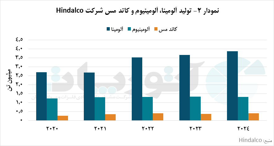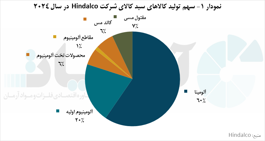 در نمودار یک، سهم تولید هر یک از کالاهای موجود در سبد کالای شرکت «Hindalco» نشان داده شده است، این نمودار نشان می‌دهد ماهیت کسب‌وکار شرکت مبتنی بر مدلی است که از یک‌ سو بر تولید حجم بالا و از سوی دیگر بر خلق ارزش‌ افزوده از طریق محصولات پایین‌دست اتکا دارد و سبد کالای متنوع شرکت، بازتاب مستقیمی از استراتژی آن در کسب سود و ایجاد ارزش است.