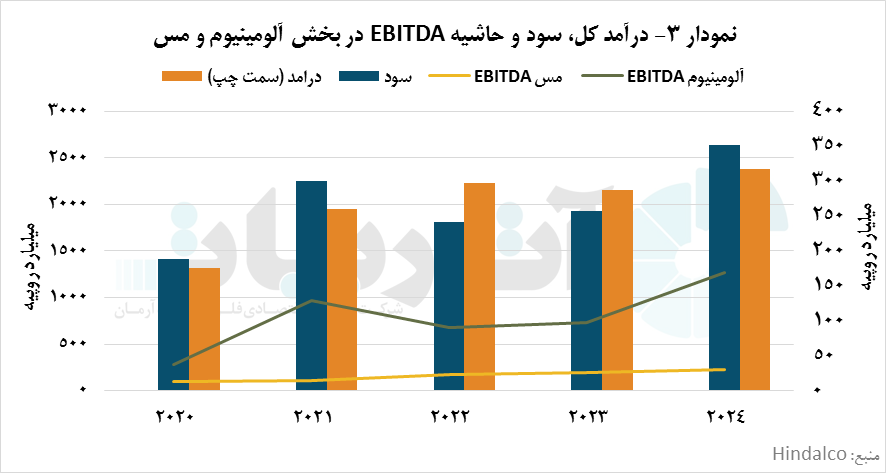 نمودار ۳، روند تاثیر وقایع سال ۲۰۲۰ را بر سود و درآمد شرکت نشان می‌دهد؛ به‌ طوری‌ که در این سال کاهش درآمد شرکت «Hindalco» برابر با ۱٫۳ تریلیون روپیه و تحت فشار جهانی کاهش قیمت فلزات، تضعیف درآمدی به‌ خوبی قابل مشاهده است و سود قبل از کسر مالیات و استهلاک (EBITDA) برابر ۱۸۸.۹۶ میلیارد روپیه بود که در آن بخش آلومینیوم با ۳۷٫۴۹۰ میلیارد روپیه و بخش مس با ۱۲.۷۶۰ میلیارد روپیه سهم متفاوتی از سودآوری داشتند.