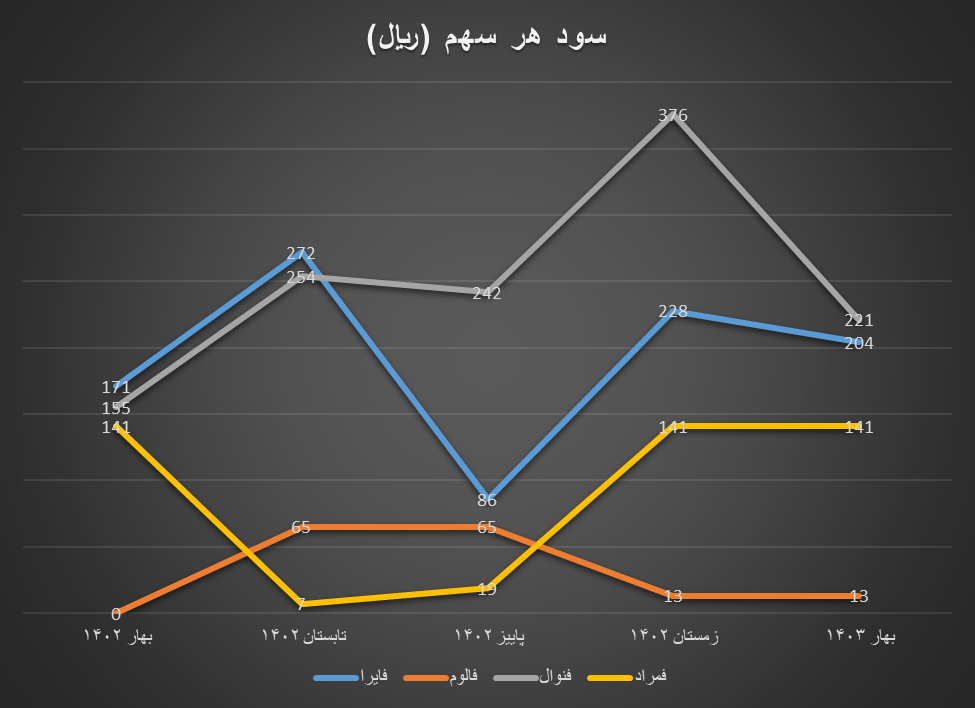 سود هر سهم فنوال در بهار ۱۴۰۳ برابر با ۱۳ ریال بود. بهار ۱۴۰۲ فنوال به ازای هر سهم صفر ریال سود شناسایی کرده بود. در تابستان و پاییز این رقم به ۶۵ ریال رسید و بر برای دو فصل متوالی زمستان و بهار در محدوده ۱۳ ریال باقی ماند. فمراد نیز از سود ۱۴۱ ریالی برای هر سهم در بهار ۱۴۰۲ به ۷ ریال و سپس ۱۹ ریال طی دو فصل بعدی کاهش پیدا کرد ولی در نهایت موفق شد در دو فصل اخیر به سود ۱۴۱ ریالی به ازای هر سهم برسد. سود هر سهم فنوال و فایرا در بهار ۱۴۰۳ بیشتر از بهار ۱۴۰۲ بود. بیشترین سود هر سهم فایرا مربوط به تابستان ۱۴۰۲ بود و برای فنوال در زمستان ۱۴۰۲ رقم خورد.