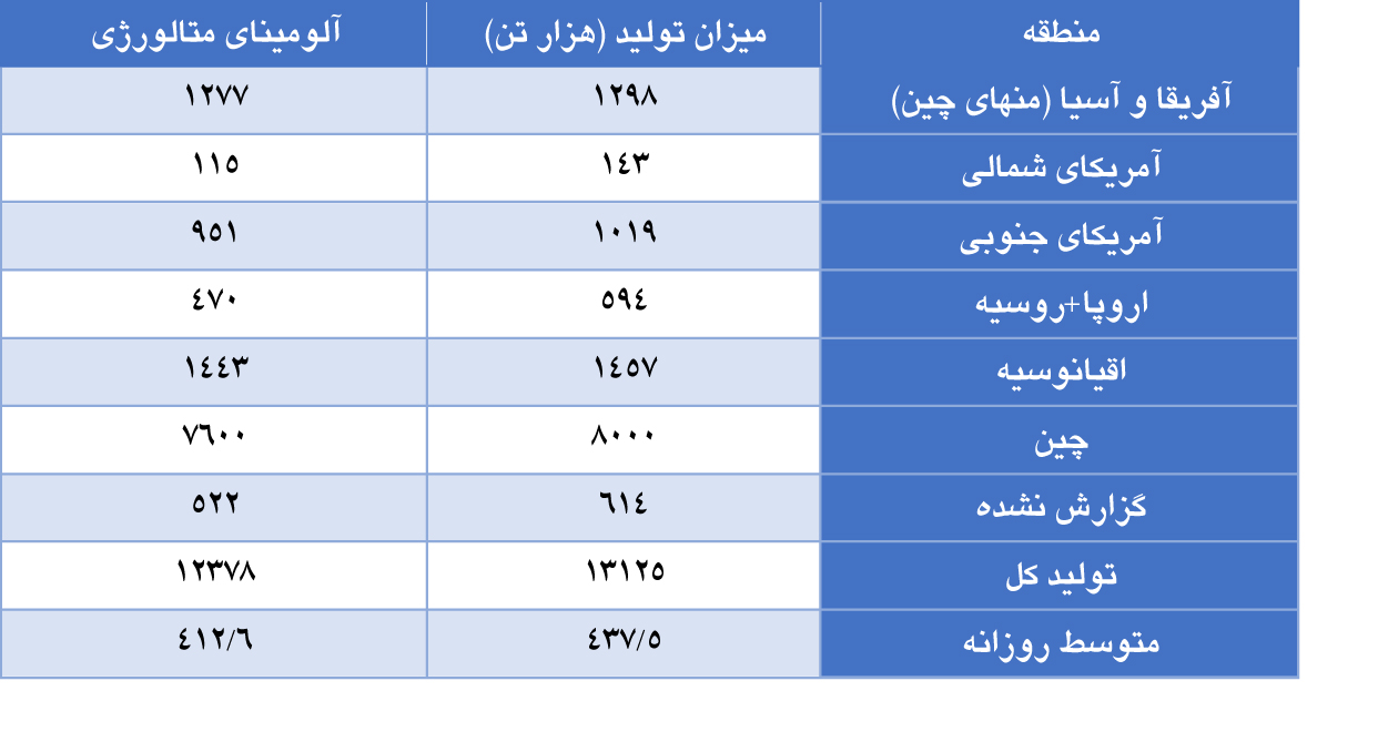 جدول میزان تولید آلومینا در نقاط مختلف جهان طی ماه نوامبر 2025 به قرار ذیل است: