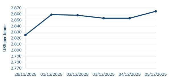 طی هفته گذشته قیمت آلومینیوم نوسان چندانی نداشته است. 5 دسامبر (14 آذر ماه) بورس فلزات لندن در حالی به کار خود پایان داد که فروش نقدی آلومینیوم 2864 دلار و 50 سنت (تن) اعلام شد.