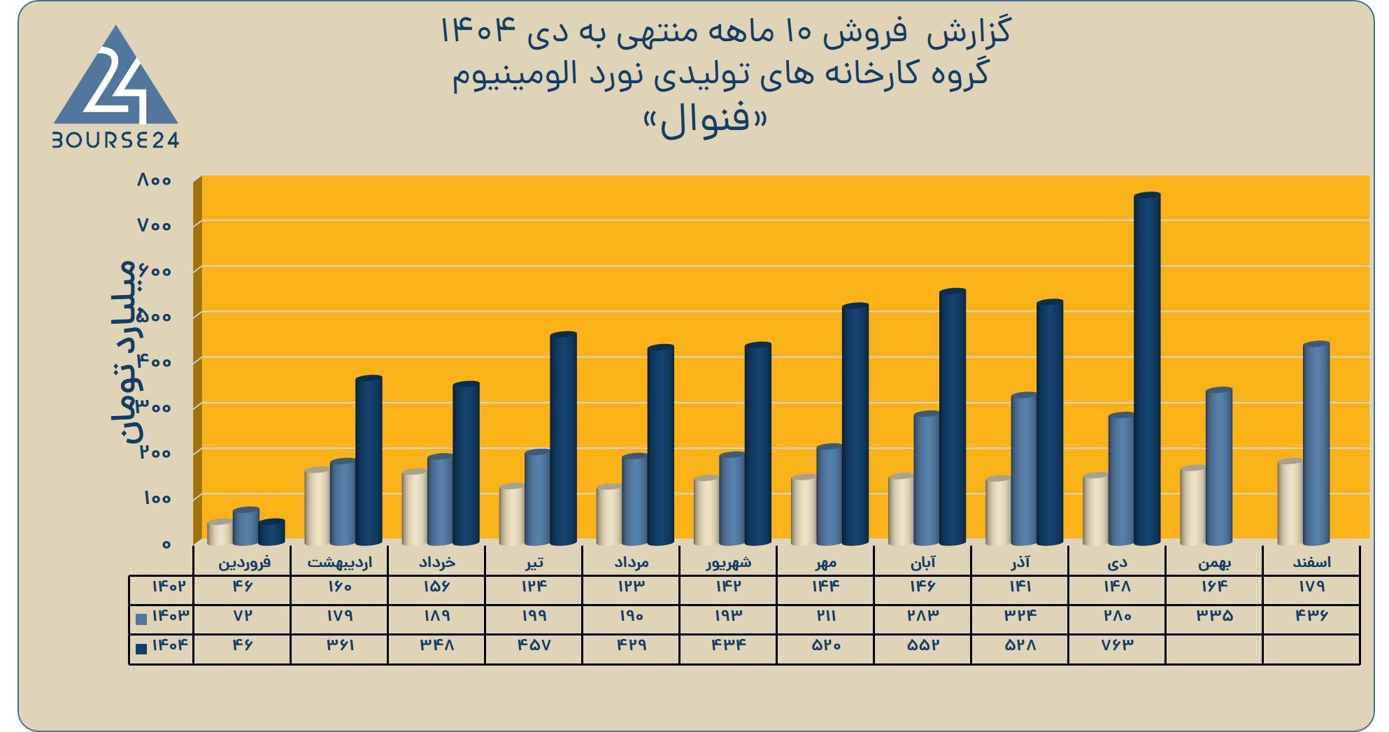 شرکت گروه کارخانه های تولیدی نورد الومینیوم که فعالیت آن در حوزه تولید فلزات اساسی می باشد و سهام آن با نماد فنوال در تابلوی بازار سرمایه ایران در حال داد و ستد است، گزارش عملکرد خود را در 10 ماهه منتهی به دی سال 1404 منتشر کرد. بر اساس اطلاعات ارائه شده آخرین سرمایه ثبت شده فنوال حدود 763 میلیارد تومان بوده است.