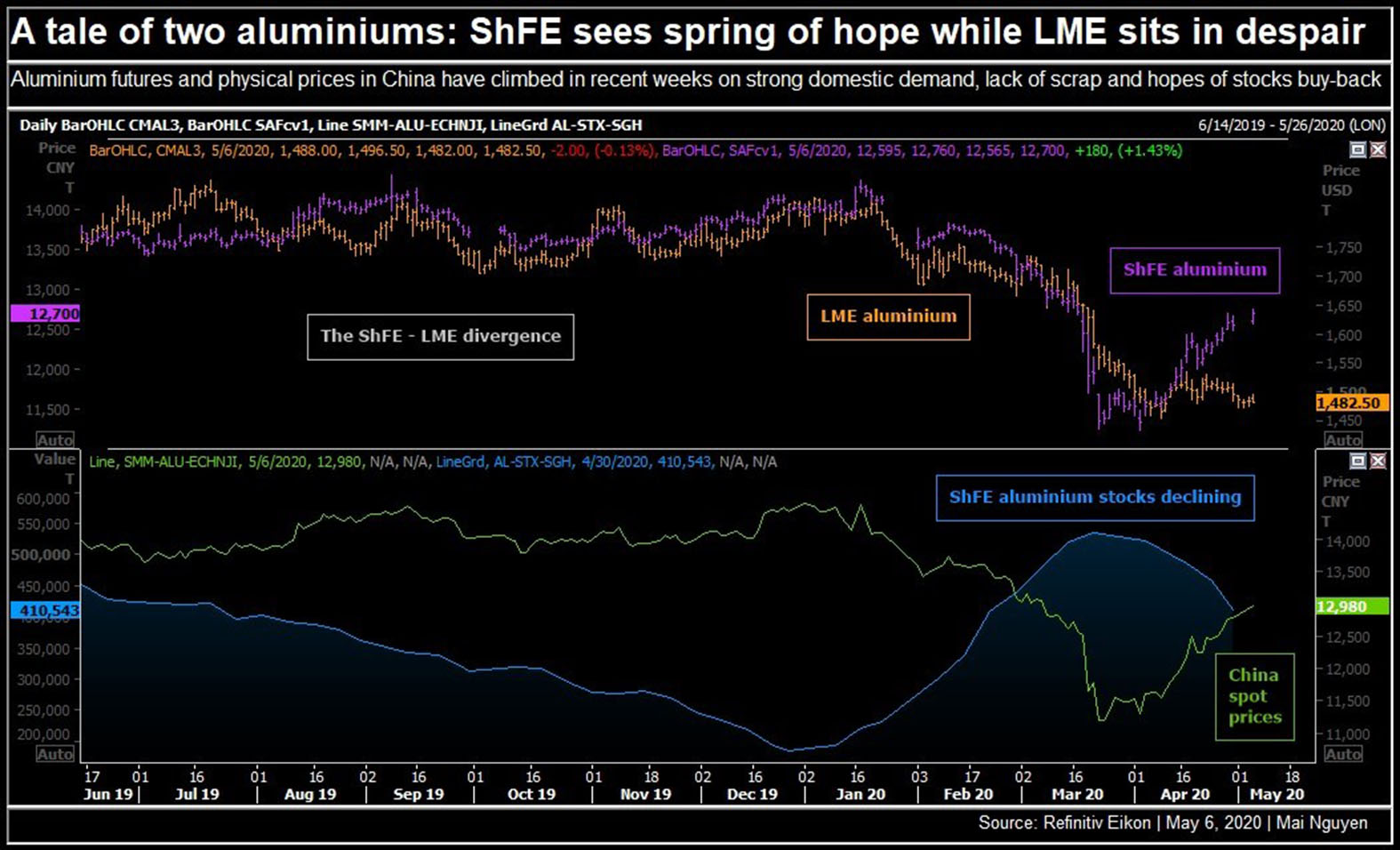 براساس این گزارش، ویرانیهایی که توسط شیوع ویروس کرونا اتفاق افتاده است، در ماه آوریل آلومینیوم در SHFE به کمترین میزان خود در چهار سال اخیر رسید و برخی از کارخانههای ذوب آهن را مجبور به کاهش ظرفیت کرد.