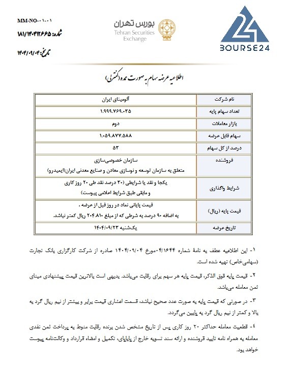 بر اساس اطلاعیه رسمی منتشرشده، این سازمان روز یکشنبه ۲۳ آذر ۱۴۰۴ تعداد ۱٬۰۵۹٬۸۷۷٬۵۸۸ سهم معادل ۵۳ درصد از سهام شرکت آلومینای ایران را به‌صورت یکجا و نقد یا شرایطی از طریق بازار دوم بورس اوراق بهادار تهران عرضه خواهد کرد.