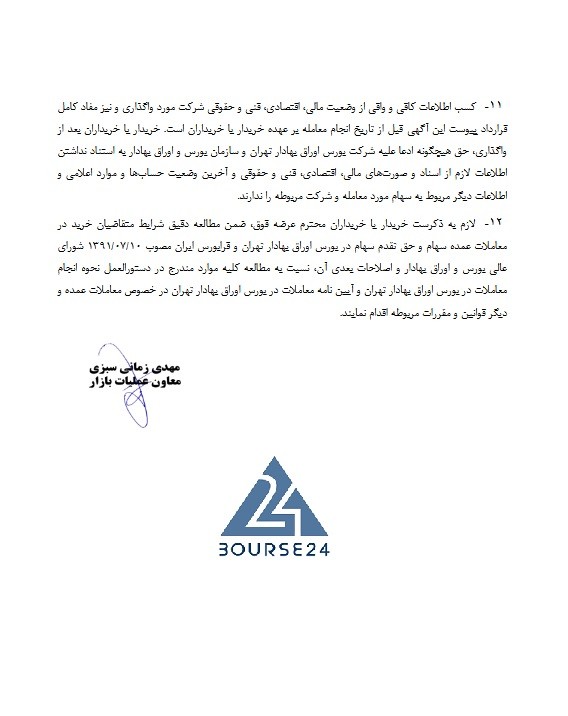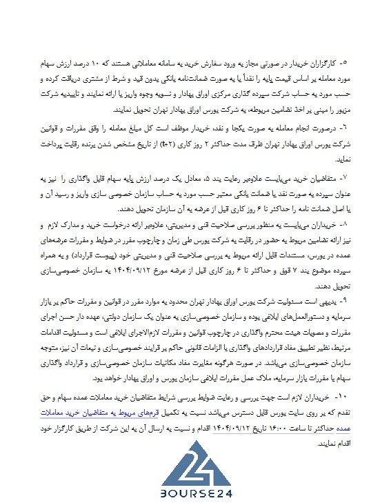 طبق دستورالعمل عرضه، کارگزاران خریدار تنها در صورت واریز یا تودیع ۱۰ درصد ارزش سهام مورد معامله (بر مبنای قیمت پایه) به‌صورت نقدی یا در قالب ضمانت‌نامه بانکی بدون قید و شرط به نفع شرکت سپرده‌گذاری مرکزی اوراق بهادار و تسویه وجوه مجاز به ورود سفارش در سامانه معاملاتی خواهند بود. تأییدیه شرکت سپرده‌گذاری نیز شرط لازم برای انجام معامله است.