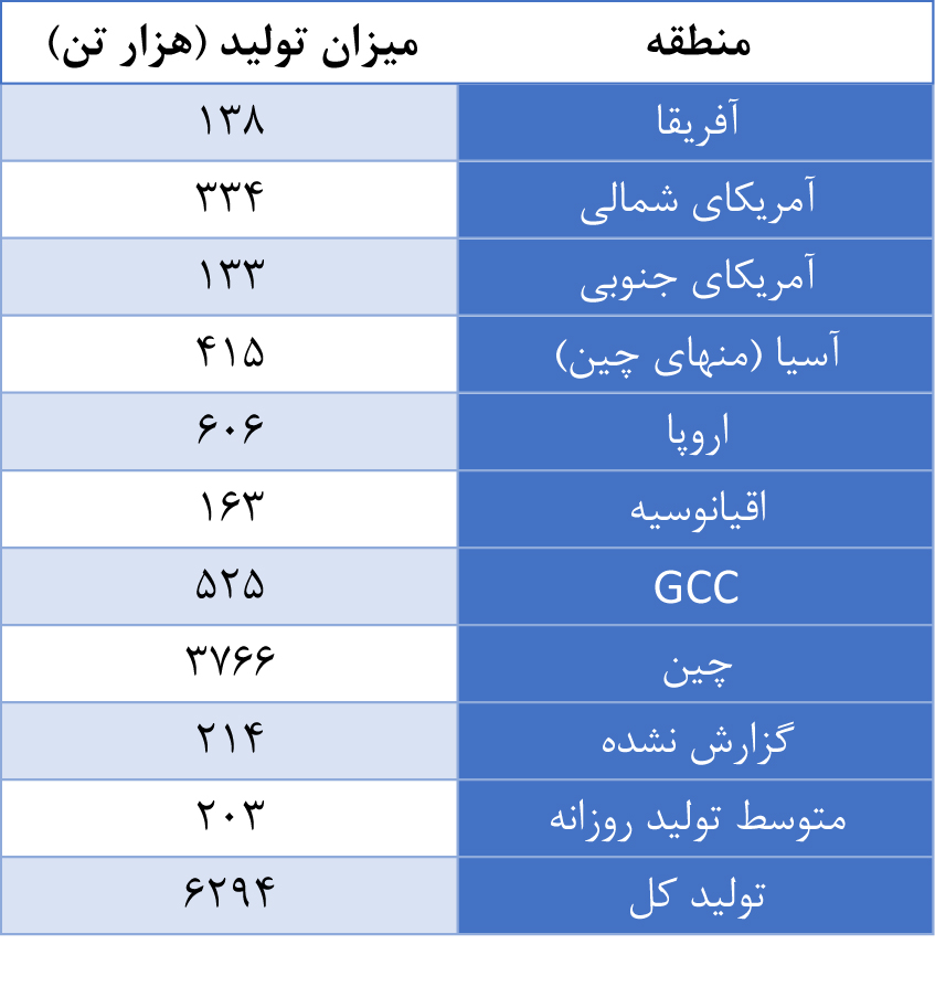 جدول میزان تولید آلومینیوم در مناطق مختلف جهان به قرار ذیل است: