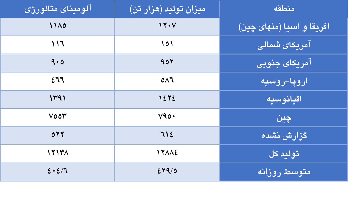 تولید آلومینا در ماه سپتامبر در مناطق مختلف جهان به قرار ذیل است: