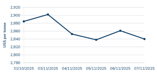 جمعه 16 آبان ماه (7 نوامبر) بورس فلزات لندن در حالی به کار خود پایان داد که فروش نقدی آلومینیوم در بورس 2804 دلار (تن) اعلام شد.